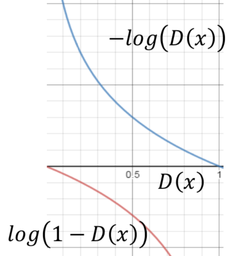 在生成模型的优化过程中,生成器的loss Function是$V=E_{x\sim P_{G}}[-log(1-D(x))]$。如上图所示,当D(x)接近0的时候,梯度非常的小。这就导致在训练的初期,生成器G如果想要骗过判别器D变化是非常的缓慢的。所以就将生成器的loss修改成$V=E_{x\sim P_{G}}[-log(D(x))]$这样可以提高训练的速度。