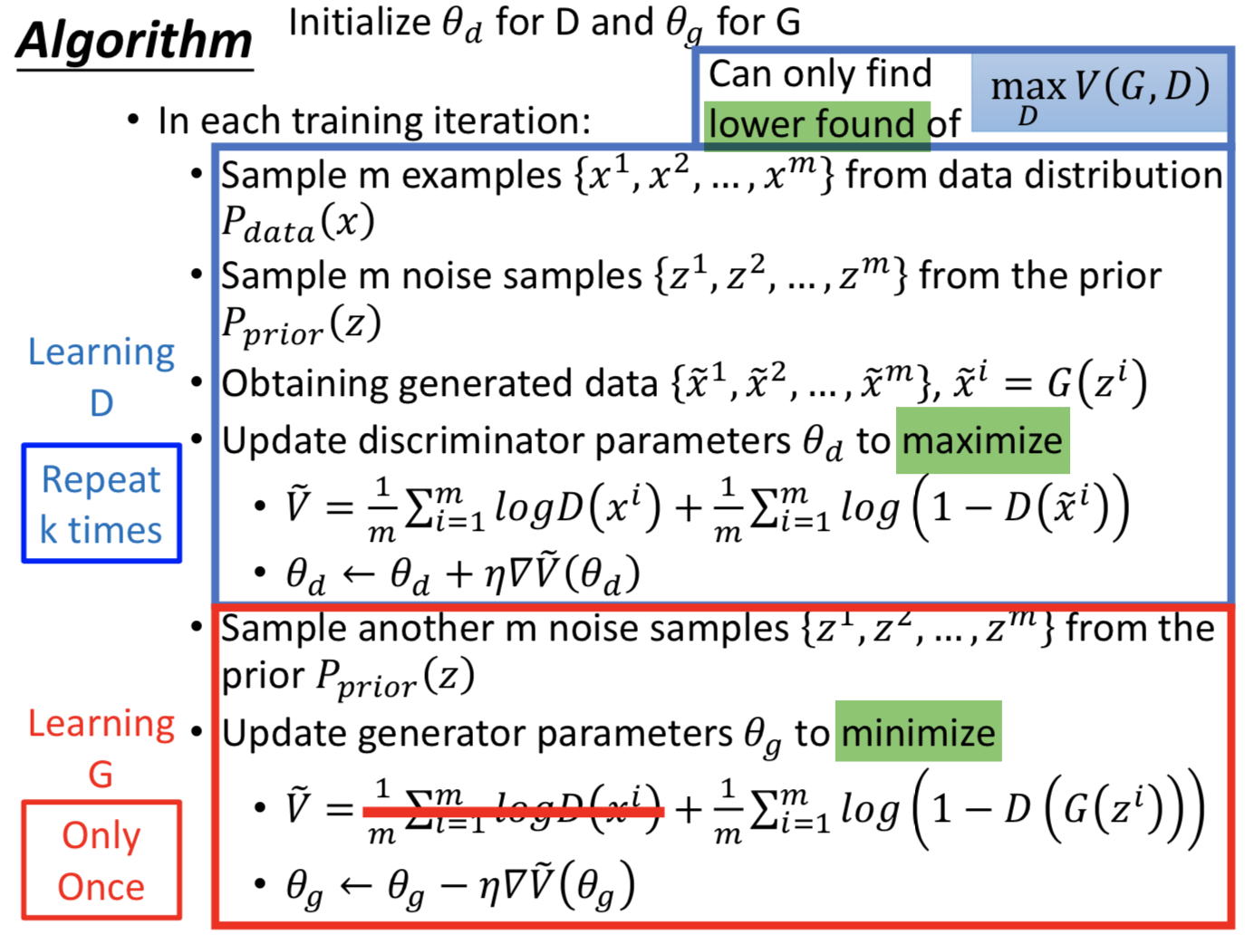 再固定D,寻找G使得$\max\limits_{D}V(G,D)$最小,也就是让来自于生成分布中的x的D(x)尽可能的接近1,这样使得生成器的能力增强。