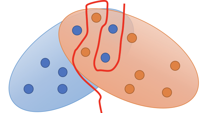 因为JSD值域是[0,log2],这也就是说明$P_G$和$P_{data}$没有相似之处,但是实际上两个分布是有相似之处的,出现问题的原因是我们在积分运算中国使用采样的方法,当训练过拟合的时候,D还是能把两部分的点给分开的,如下图所示。