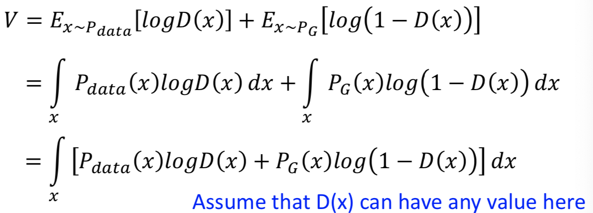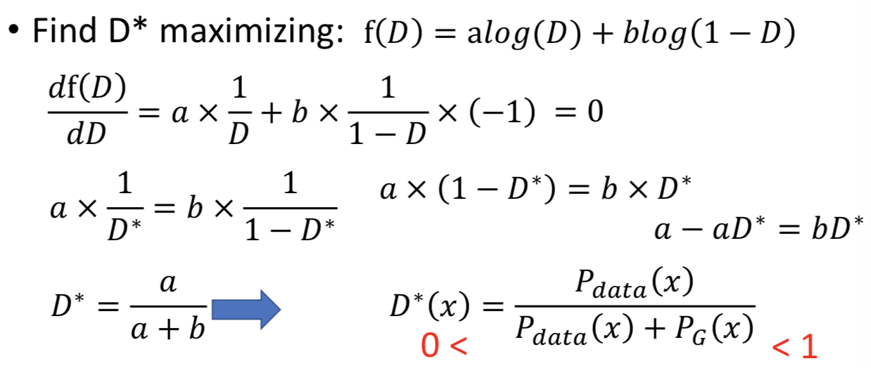 接下来给定x,求$D^*$使得被积函数取极大值。$P_{data}(x)$和$P_{G}(x)$是已知值,只 需要对D求导即可得到极大值。