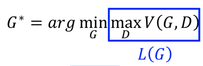 $G^*=arg\min\limits_{G}\max\limits_{D}V(G,D)$