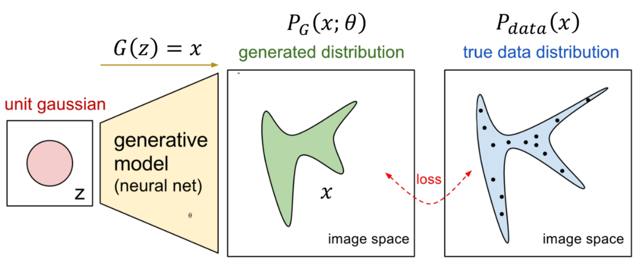 给定真实数据分布$ P_{data}(x)$,此处的x代表真实图像构成的向量;设生成模型的分布$P_{G}(x;\theta)$,这个生成分布由$\theta$决定,生成图像模型的目标就是使得生成模型分布$P_{G}(x;\theta)$尽可能的接近真实数据分布$ P_{data}(x)$,也就是要计算$\theta$。