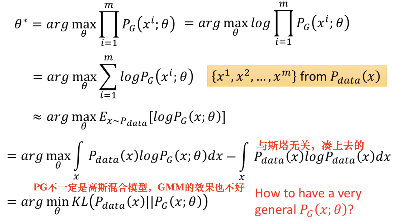 使用最大似然估计求得$\theta$的过程如上图所示,对似然求log变成log似然;真实分布中的所有x的期望等价于概率积分,所以可以转化成积分运算,因为减号之后的积分与$\theta$无关,所以添加上去之后还是等价的;经过这样拼凑之后最大似然估计可以变成求两个分布之间的KL散度,两个分布越相似,KL散度值越小。