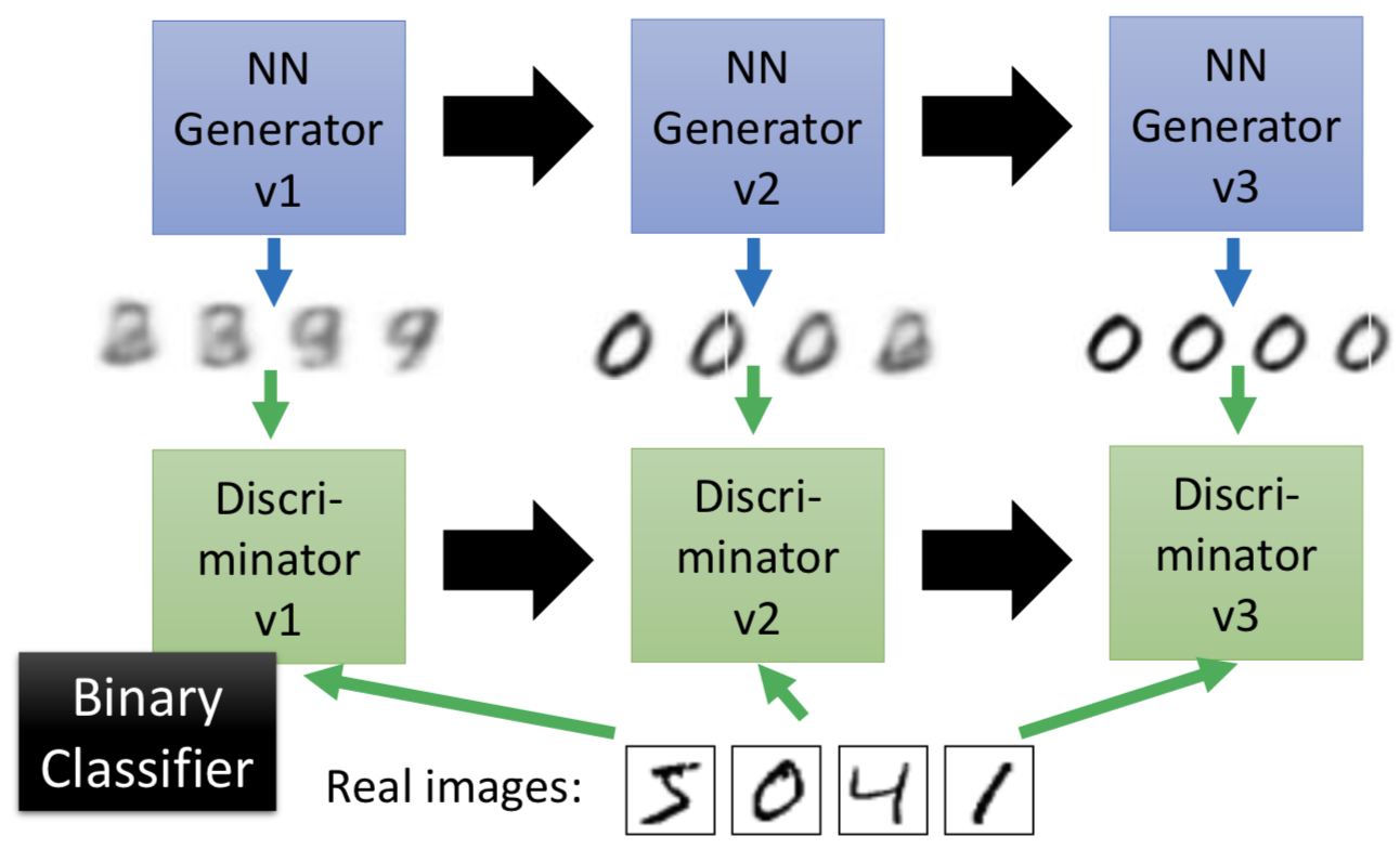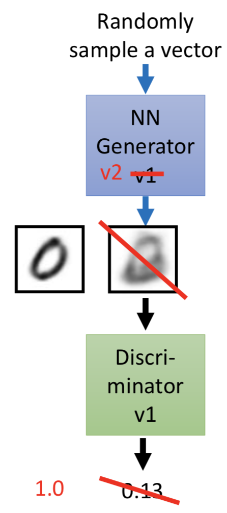 若是Discriminator对生成图像的判分较低,则Generator参数进行梯度下降更新(此时固定Discriminator);再将第二轮Generator生成的图像输入到Discriminator进行判断,若是Discriminator对其判分较高,则更新Discriminator参数。