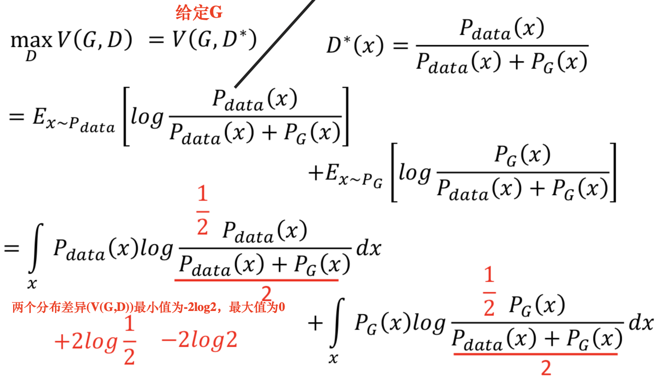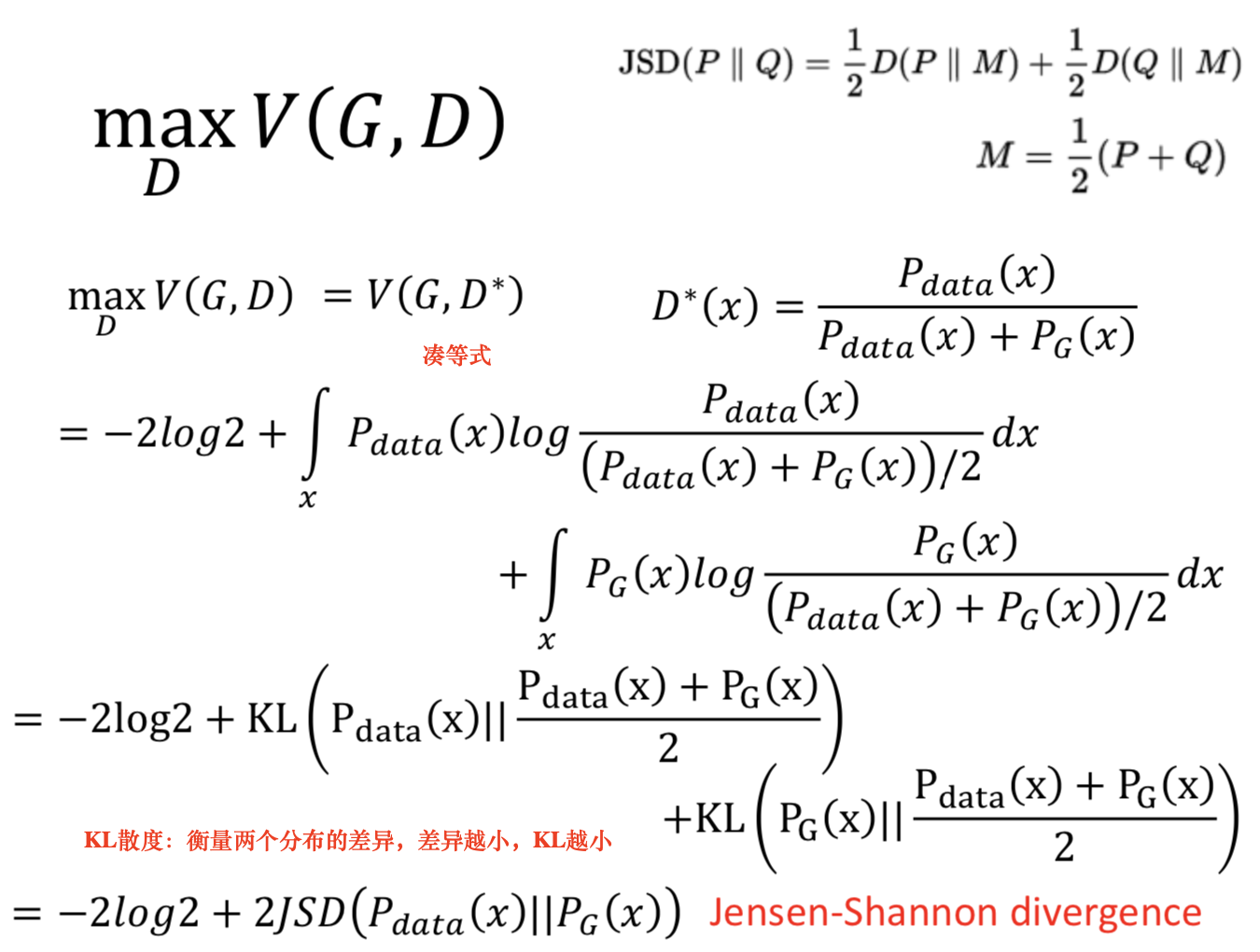 上图的推导主要是凑出JSD分布的形式,JS Divergence是KL散度的对称平滑版本,也是描述了两个分布之间的差异。因为JSD值域[0,log2]所以 $\max \limits_DV(G,D)$的取值范围为[-2log2,0]。