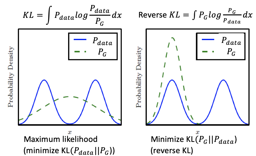 如上图所示,若是第一KL散度的写法,为了防止出现无穷大,所有有$P_{data}$出现的地方都必须有$P_G$覆盖,这样就不回出现Mode Collapse。