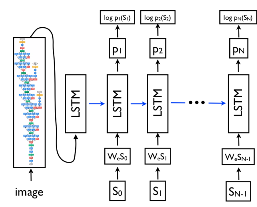 其中$I$为输入的图像,$S$为生成的句子,$\theta$是模型的参数,我们要做的就是最大化这个目标函数,获得模型的参数$\theta$。(此处最大似然之后取log形式)