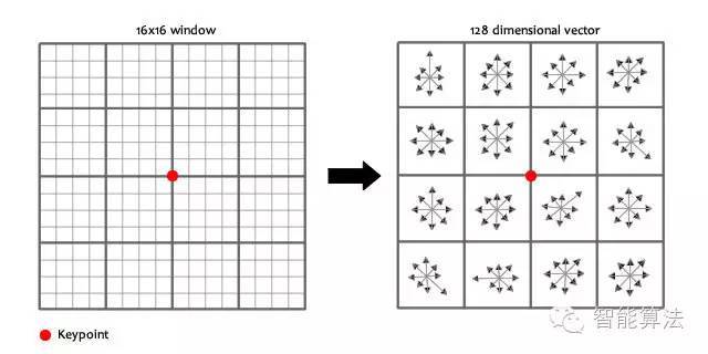 计算keypoint周围的16*16的window中每一个像素的梯度,而且使用高斯下降函数降低远离中心的权重(高斯下降函数使得离关键点越近权重越大,越远越小)。