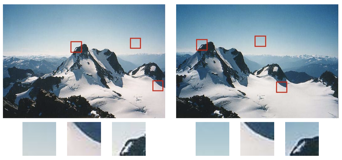 如上图,对于两幅视角不同的同一幅图像能够被很好的匹配和跟踪。武鸣县纹理结构的图像快几乎不可能定位,而拥有较大对比度变化(梯度)的则比较容易定位,并且至少拥有至少两个(明显)不同方向梯度的图像块最容易定位。