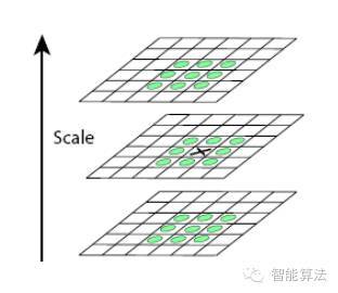 为了寻找尺度空间的极值点,每一个采样点要和它所有的相邻点比较,看其是否比它的图像域和尺度域的相邻点大或者小。如图所示,中间的检测点和它同尺度的8个相邻点和上下相邻尺度对应的9×2个点共26个点比较,以确保在尺度空间和二维图像空间都检测到极值点。 一个点如果在DOG尺度空间本层以及上下两层的26个领域中是最大或最小值时,就认为该点是图像在该尺度下的一个特征点,如图所示。