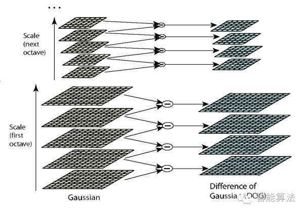 对于一幅图像I,建立其在不同尺度(scale)的图像,也成为子八度(octave),这是为了scale-invariant,也就是在任何尺度都能够有对应的特征点,第一个子八度的scale为原图大小,后面每个octave为上一个octave降采样的结果,即原图的1/4(长宽分别减半),构成下一个子八度(高一层金字塔)。