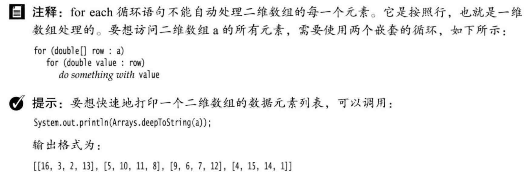 - for (int element : a) 循环数组a中的每一个元素”(for each element in a)。