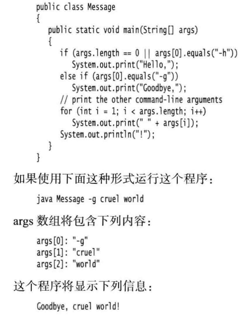 - 每一个 Java 应用程序都有一个带 String arg[],参数的 main 方法。 这个参数表明 main 方法将接收一个字符串数组, 也就是命令行参数。